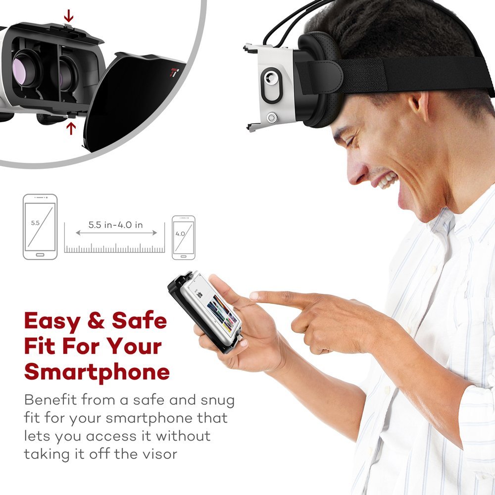 あなたにとって、そのスマートフォンは、まだ2年契約が残っていて、まだまだ大切にしないといけないとか、いやもう別に壊れてもいいやつだとか、そういうご心配は無用です。スライド式で着脱できるバイザーです。さらに中のアームは調整可能で、しっかりと4~5.5インチのスマートフォンが固定できます。出し入れできる工夫がされたヘッドセットです。